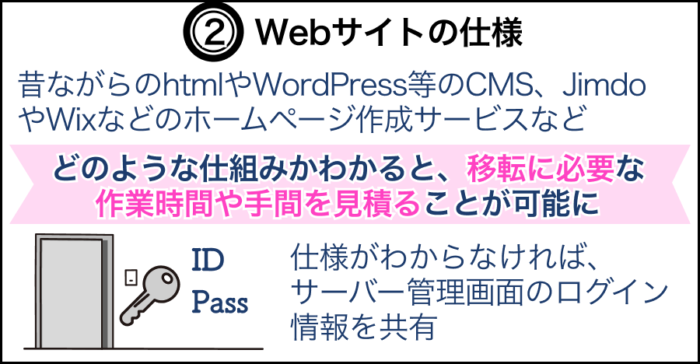 もしどのような仕様で作られているか分からない場合には、サーバー管理画面のログイン情報を共有して実際の中身を見てもらうようにしましょう。