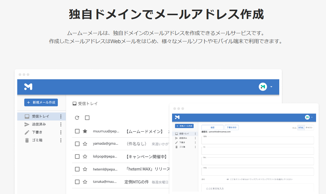 最大の特徴は、オリジナルのメール画面を提供している点です。PCやスマホなどデバイスは関係なく利用できます。